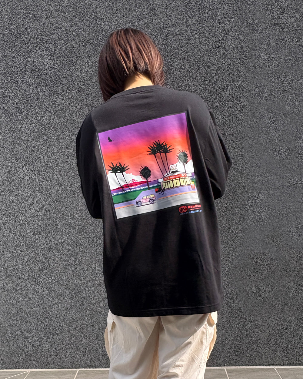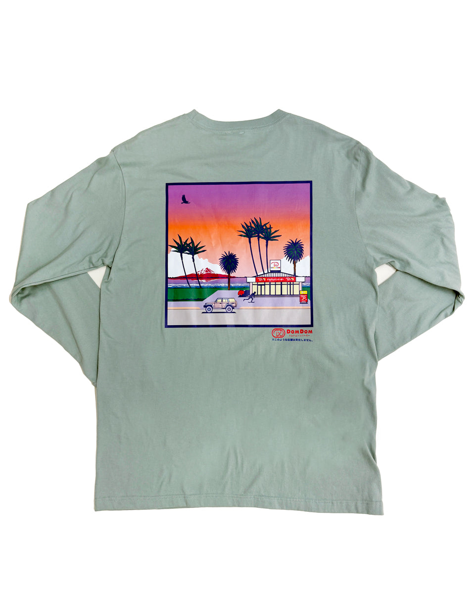バックには海辺のドムドムの架空の店がデザインされた、シティーポップ調のロングTシャツ!